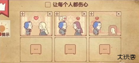 4、最后一步,把 “婚礼” 道具拖进第四个虚线框。再次把 “张友志” 和 “陈小梅” 一起拖进这个婚礼框。有趣的事情发生了,虽然变成幽灵状态,但两人再次相爱,成功通关