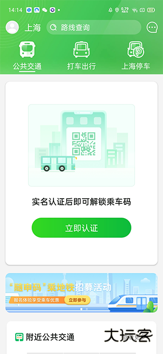 1、进入软件,公共交通需实名认证后即可解锁乘车码,软件目前支持支付宝账户认证、银行卡实名认证、手机号实名认证;
