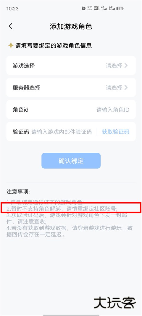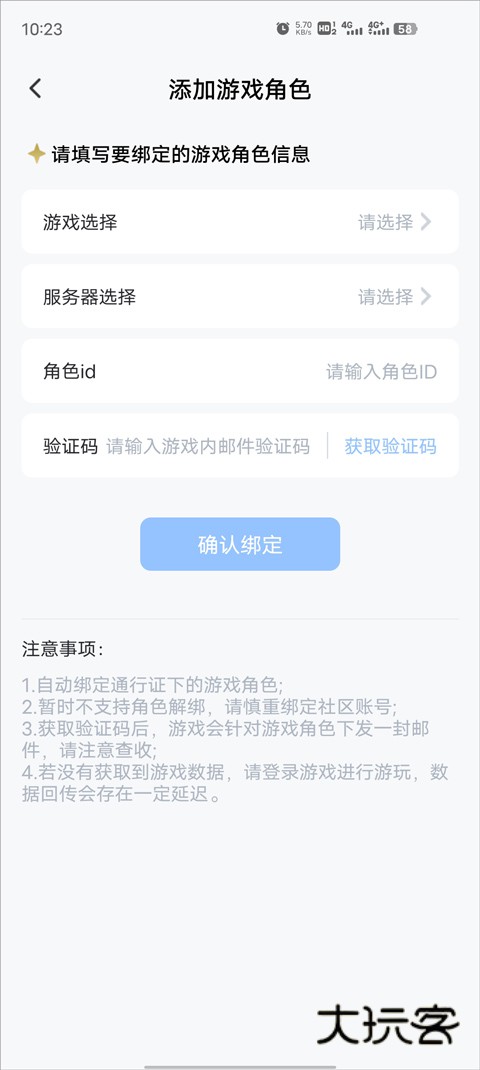3、最后添加游戏角色,填写要绑定的游戏角色信息,然后点击确认绑定即可。