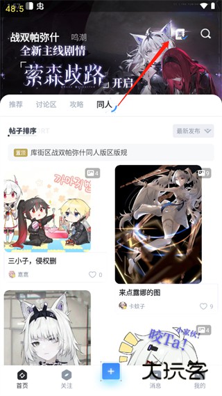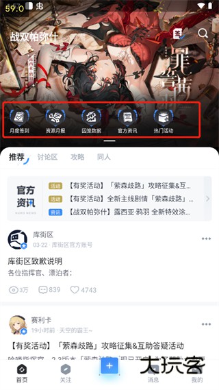 2、首先,作为一个游戏社区,库街区为用户提供最新的游戏资讯和动态,方便用户快速获取游戏关键信息,如提供【推荐】、【讨论区】、【攻略】、【同人】等不同的内容版块。