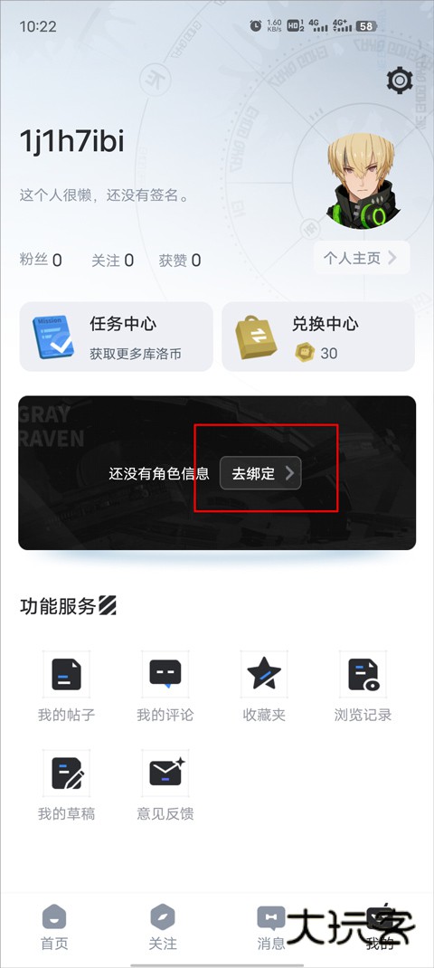 1、首先打开库街区,点击右下角“我的”,可以看到还没有角色信息,点击“绑定”;