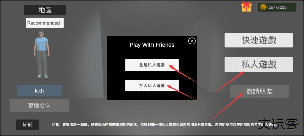 3、选好角色后,点击 “创建私人房间” 来开房间。想拉朋友一起来玩?直接在邀请界面分享链接,让他们安装游戏就行