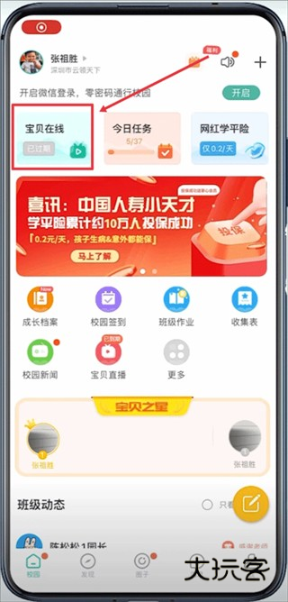 1、打开app后,在校园页面中点击宝贝在线