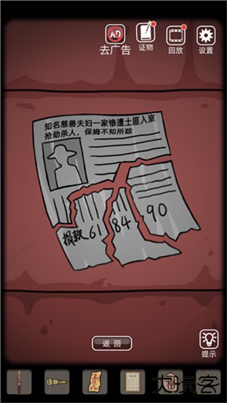8、接着看电视机旁边,左边有盏小灯或灯泡,点它看看,又能找到一张报纸碎片。拿着所有找到的碎报纸片,回到有沙发的那个客厅,把它们像拼图一样完整拼起来,拼完后报纸上显示出另一组线索数字 “618490”,这个更要牢牢记住