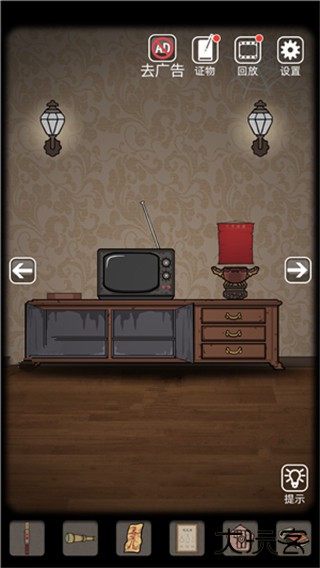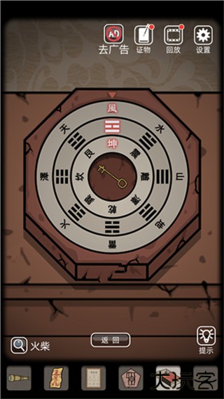 11、点完香再看看电视机左边,那儿应该有个八卦形状的盒子。依照刚刚获得的 “风、坤” 线索提示,把八卦盒的盘面转动着调整一下,对正确了位置后盒子就会打开,里面是开门的钥匙。拿到钥匙后就可以去打开探索到的第一个房间的门锁了