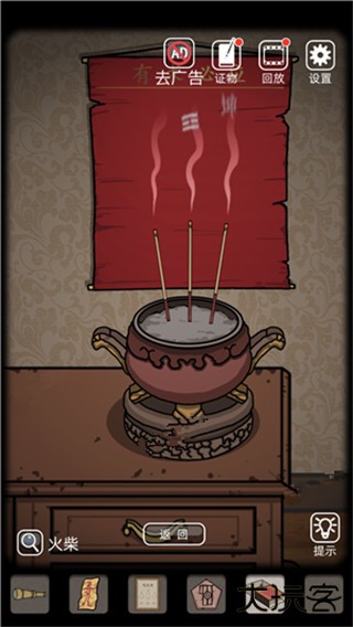 10、视线移到柜子上方的香炉上,把之前抽屉里拿到的三根香都插进香炉里。然后掏出火柴盒,擦根火柴把这三根香挨个点上,点着后香炉附近会浮现出新的文字线索 “风、坤”
