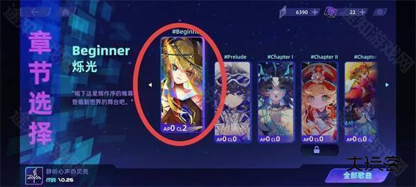 左右拖动屏幕可查看其他章节,点击任一图标即可进入对应章节曲目选择界面。下面的AP代表本章节内乐曲的满分个数,CL代表解锁并游玩乐曲的个数(进入章节选择不同的难度,外面的AP和CL显示也会有对应的变化)