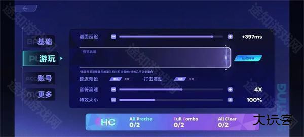 在此界面,玩家可以调试谱面延迟,音符流速和特效大小。通过延迟向导,玩家可以轻易将延迟调成自己合适的范围内,使用谱面延迟选项的-+符号可以微调,也可以直接拖动延迟条进行调整。玩家可以使用延迟预设,在默认和无线之间切换延迟选项,以应对多种场合(扬声器,有线耳机,无线耳机等)。