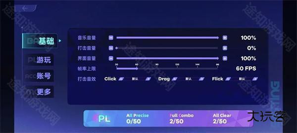 在此界面,玩家可以对音乐音量,打击音量和界面音量进行调整,并可以选择帧率上限和打击音效。如果玩家的谱面延迟过高,建议关闭打击音量。