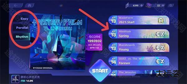 进入章节后,可选择乐曲进行游玩,点击右边箭头所指的歌曲来切换。点击左边圆圈的选项可切换难度。(部分乐曲拥有Rhythm,Havoc难度)圆圈上方的箭头可以回到章节选择界面,房子图标可以回到主界面。点击START开始曲目。
