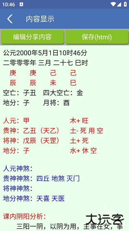 1、可以根据选定的年、月、时间、地点,生成标准的六人黄金公式课,显示千神将方的详细信息,包括阴阳、五行、盛衰、神。