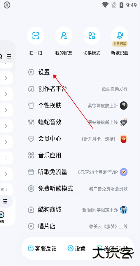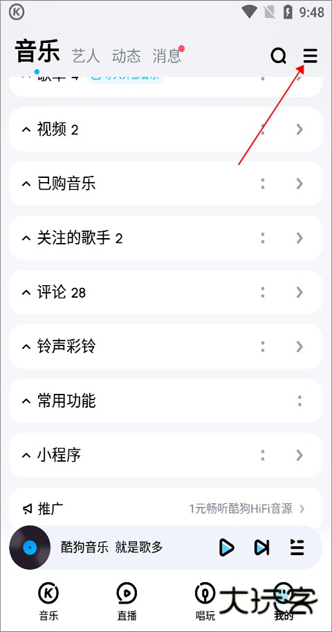 接着前往酷狗音乐app【我的】页面中点击右上角的扩展小图标(下图红色箭头所指)