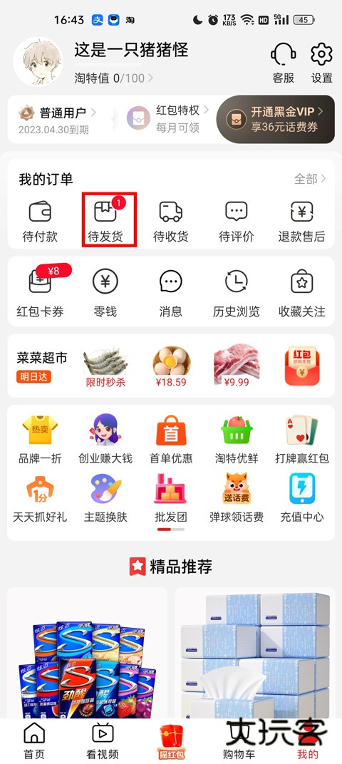 2、在个人页面中的我的订单下方找到“待发货”点击进入;