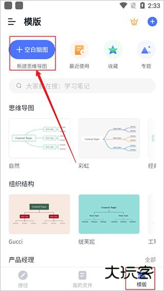 1、打开Processon软件,在【模板】区域选择【空白脑图/新建思维导图】。