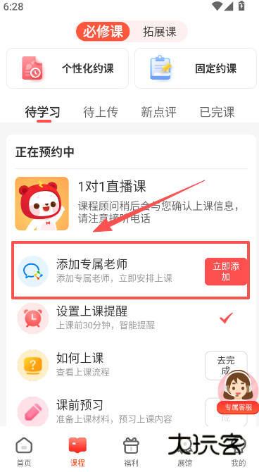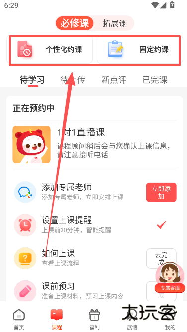 1、在课程页面上方,点击选择个性化约课或是固定约课。