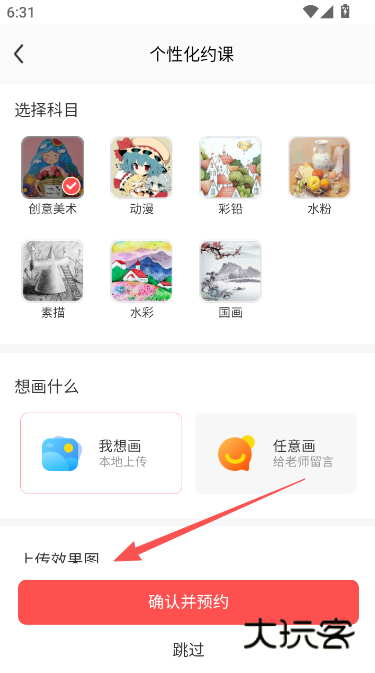 3、在个性化约课界面选择科目,添加本地上传或是任意画并上传最终的效果图,点击确认并预约。
