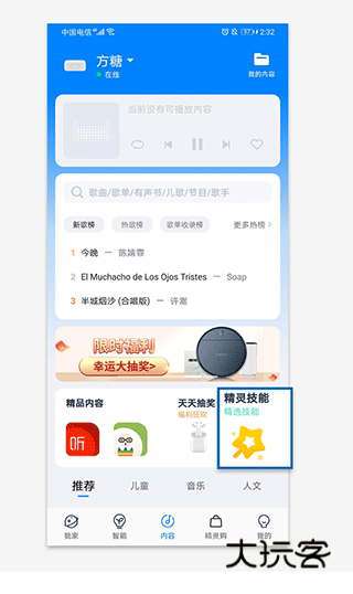 1、首先需要打开天猫精灵app,进入内容界面后点击精灵技能