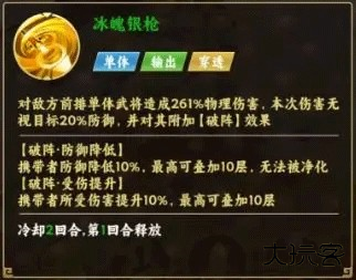 最后的核心输出来自神・马云禄。队友们前面做足了铺垫:控住了敌人、套上了盾、加了攻、清了负面。神・马云禄就能在安全的环境里肆意发挥了。她的一技能【冰魄银枪】带着强力的【破阵】效果,每次攻击都能叠加削弱敌人防御和增加自身伤害的层数。几枪下去,被层层减防、打不出反击的敌军防线,很容易就被她一枪击穿、彻底粉碎