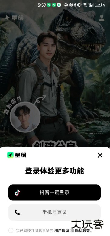 1、打开抖音星绘ai软件,在首页点击立即创建你的分身,选择上传创建