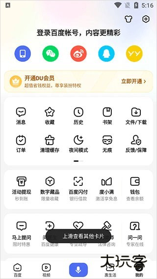 4、“我的”页面内容丰富,可以查看自己收藏的网页、历史搜索记录、书架以及下载的文件等;