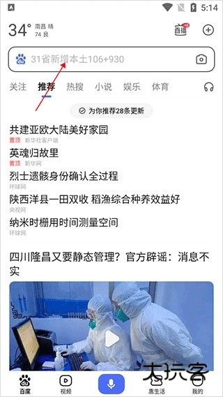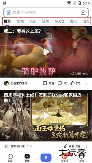 2、点击“视频”可以看到很多类型的影视和流行热门短视频,上方左右滑动可以调整分类;