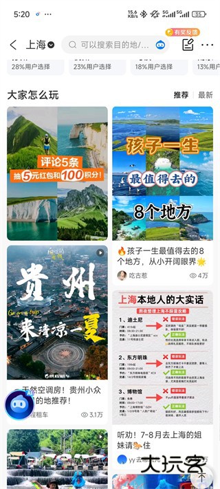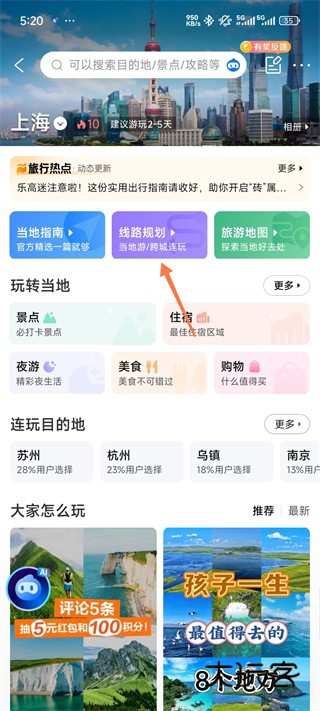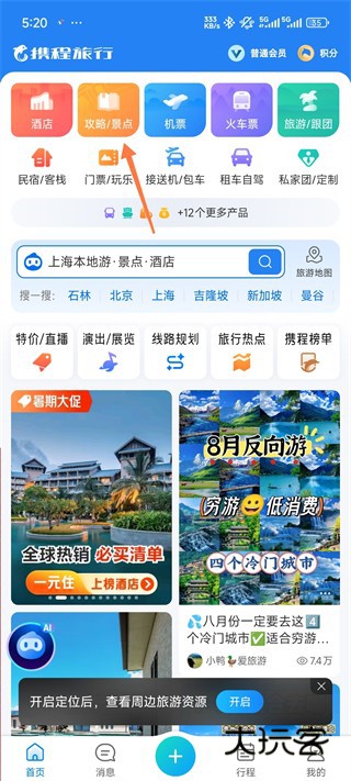 3、如果想出去玩又路线的话,可以点击【攻略/景点】板块