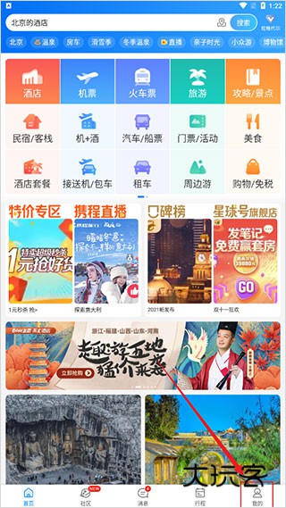 1、携程旅行,在首页可以看到内置AI功能,点击