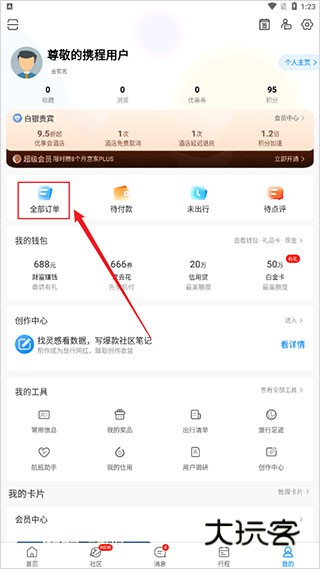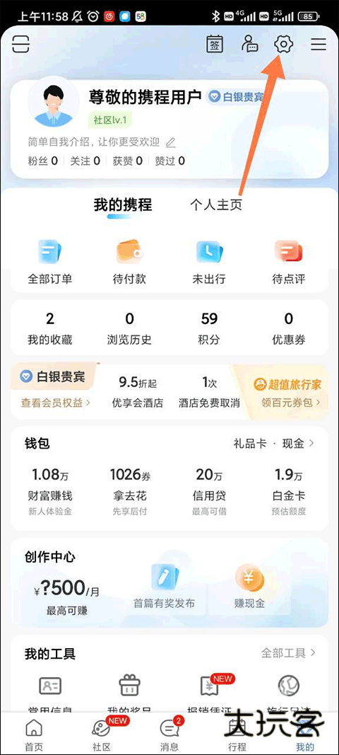 进入携程旅行后,点击底部的”我的“进入个人中心,可以看见个人中心里面有着许许多多和我们自己有关的功能,这个时候需要点击右上角的小齿轮图标进入设置。