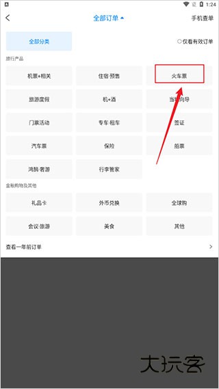 4、然后在下拉中就可以查看所有相关订单,选择【火车票】。