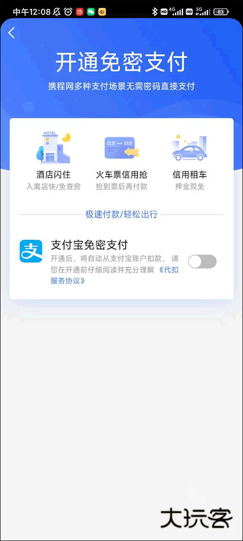 进入后可以看见能够开启支付宝免密支付,但需要注意的是:开通后,将自动从支付宝账户扣款,请您在开通前仔细阅读并充分理解 《代扣服务协议》这个功能如果要开启的话大家得自己考虑是否需要,需要的话直接点击能够开关就能够开启,而关闭也是同理,今天的教程就到这了。