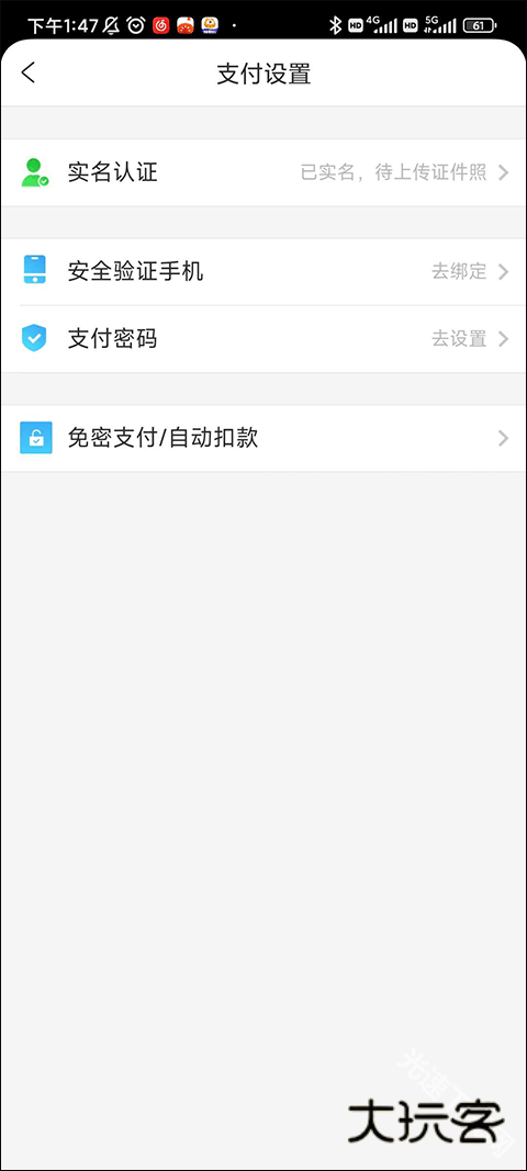 进来支付设置界面后能看里面有实名认证、安全验证手机、支付密码、免密支付/自动扣款4个功能;实名认证就是将自己的个人信息绑定在账号上;而安全验证手机则是将用户的手机号与账号进行绑定,以便账号的安全和便于让用户使用手机号进行登录;支付密码则是当用户进行消费时保障用户的财产安全;下面就是今天教程的核心:免密支付了,我们现在点击它。