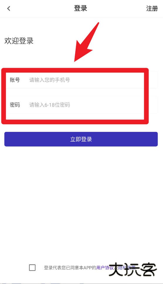 1、进入登录页面时,用户需输入手机号和密码完成登录,并在下方勾选同意用户协议及隐私政策,确保账户信息安全。