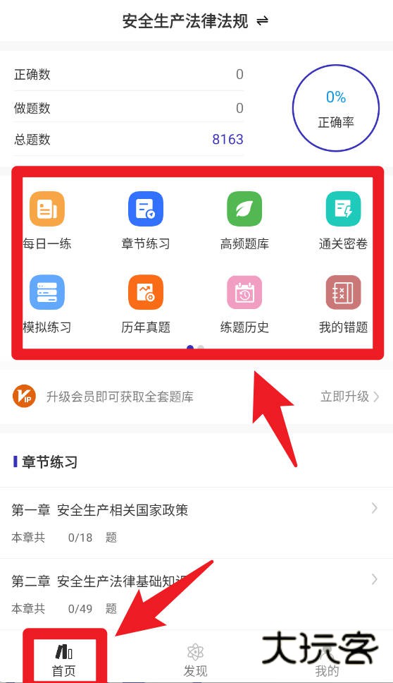 2、在首页界面,用户可以使用每日一练、章节练习、高频题库、通关密卷、模拟练习、历年真题、练题历史和我的错题等功能,全面提升学习效果。