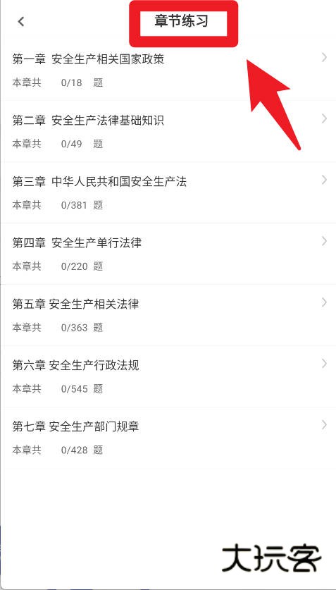 3、在章节练习页面,系统按章节分类展示题目,用户可以逐章逐节进行练习,覆盖国家政策、法律知识及安全生产相关法规等内容。
