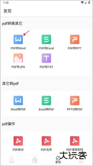 1、打开app之后默认进入到首页,切换到【发现】页面,会看到有很多功能选项,点击“PDF转Word”。