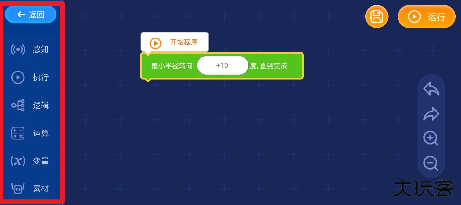 3、切换至「编程」模式后,可拖拽感知、执行、逻辑等模块进行积木式机器人指令编排。