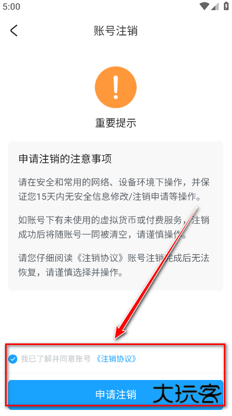 5.勾选我已了解并同意账号《注销协议》,再点击申请注销。
