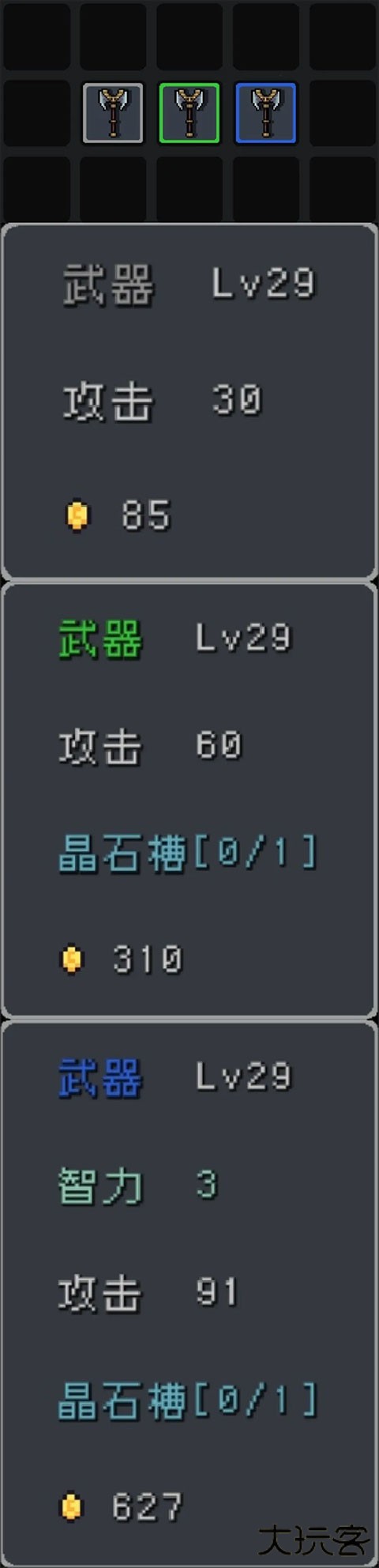 装备等级 (Lv):范围是 0 到 29 级,等级直接影响装备的攻击、防御等基础数值。注意,装备的等级是固定的,不能改变。达到 63 层及以上,掉落的必定是 Lv29 的装备。