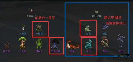 1、哎呀开局总是资源紧,快合个绿草出来当肉盾最实在啦!它自己会回血,前几回合血量够看,稳稳地顶在前面挨揍就好