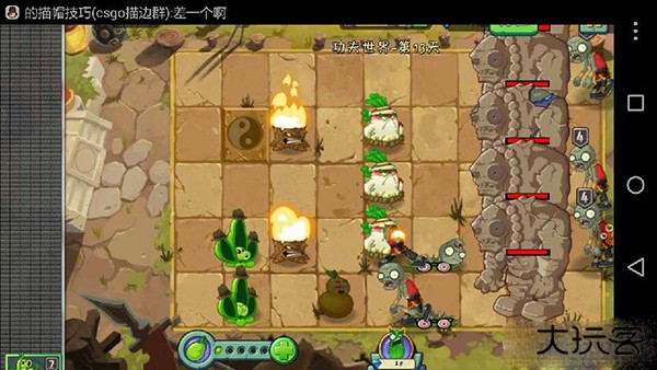 3.第一波僵尸推掉之后,就可以种植其他的植物。如果他脚下有一个地刺或者刚好点了一下火葫芦,就可以直接秒杀巨人。在石块完全碎掉时那一秒的缓冲时间,对巨人造成任意伤害都会死亡的bug。