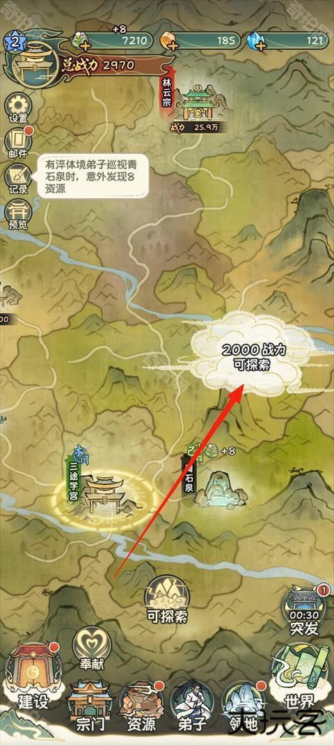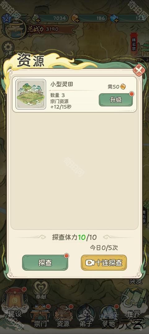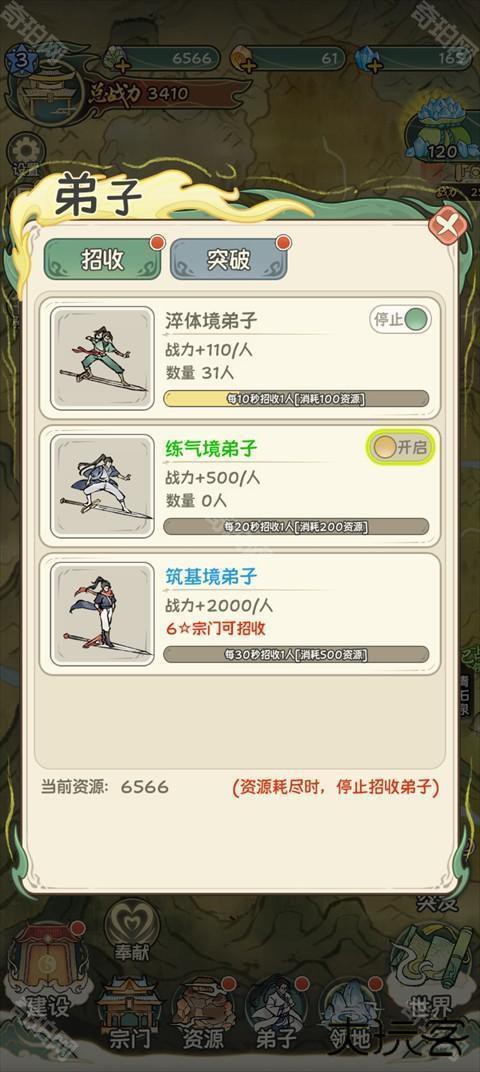 1、玩家进入游戏后,招募弟子逐步占领这个世界,达到战力即可攻占