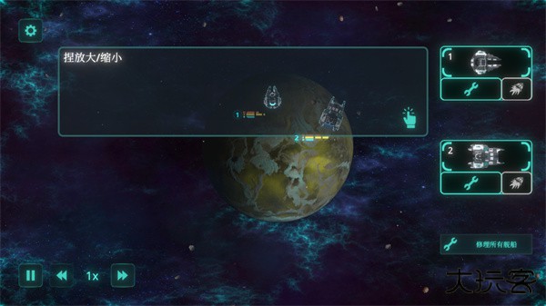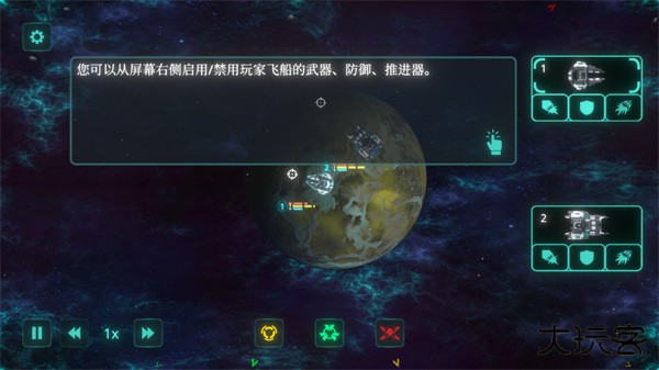 8.你还可以从屏幕右边启用或者禁用玩家飞船的武器、防御以及推进器。