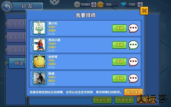 玩家可以点击【我要拜师】按钮,看到众多有收徒意向的玩家。如果在列表里没找到心仪的师傅,也可以点击【发布拜师】按钮,征集师傅,此后等待师傅们联系即可。成功拜师后,如果玩家有同门兄弟兄妹,可以愉快交流切磋,在师傅的带领下共同成长。