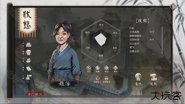 学问是很多武功的入门条件,嘴力对应战斗中的嘴炮,高了可以让对手放不出招。性情、处世、道德、修养在剧情投骰子时会有加成或者减值。技能需要在剧情和学习中获得。