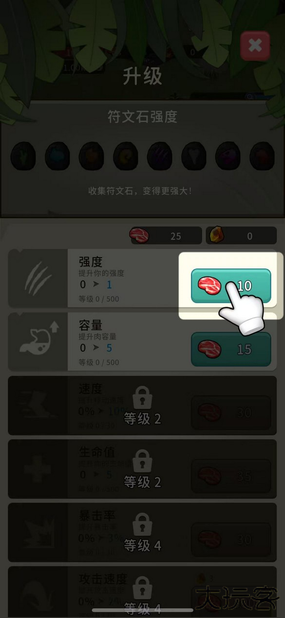 5. 屏幕上方紫色进度条满格后点击,会弹出升级面板。用捕猎积累的点数,可以给撕咬力量提升 5%,或让奔跑速度提高 10%。每次升级时恐龙周身会闪金光,体型也会略微增大