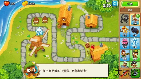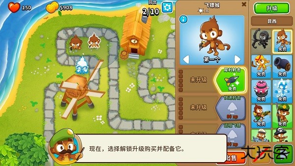 虽然解锁了升级,但仍需要在游戏中对猴子进行相应升级。具体操作,点击地图上已上阵的猴子,现在你可以选择解锁升级购买并配备它。