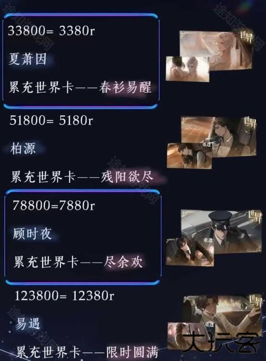 2、这些都需要玩家累计充值达到一定金额才能获取,分别是12380元、7880元、5180元、3380元,所以只推荐氪金玩家拿。