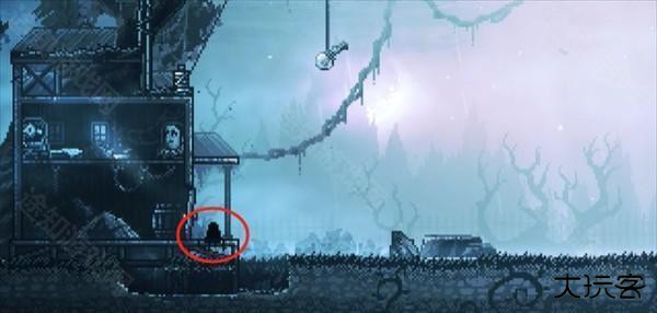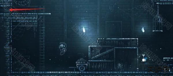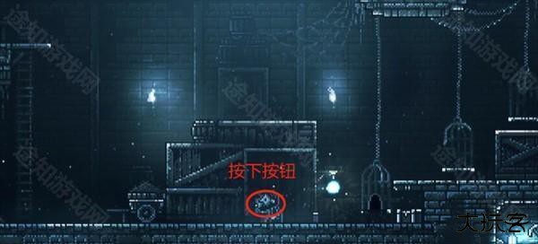 7、流浪者视角。按下黑色怪物左边的按钮,3个铁笼升上去,爬上铁笼往右走,然后爬最右边的梯子上去。