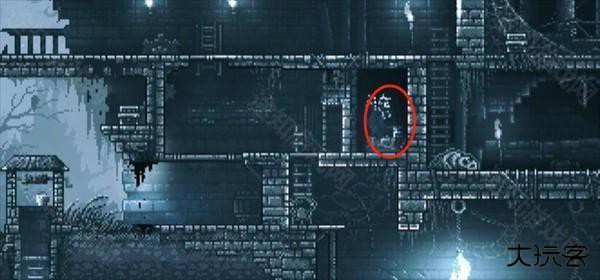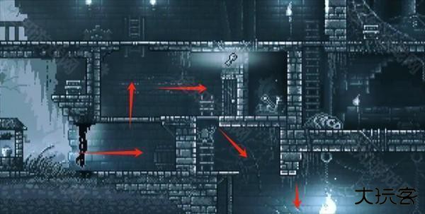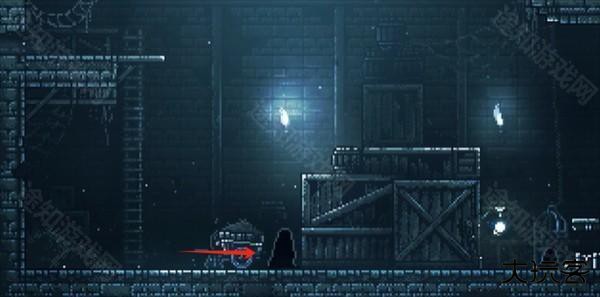15、遭遇怪物后,迅速返回下图的地方,等怪物跳过右边后,迅速爬左边的梯子,往左跑,跑到左边的尽头后往上爬,爬到最高层后往右跑,直到怪物掉进尖刺坑里。