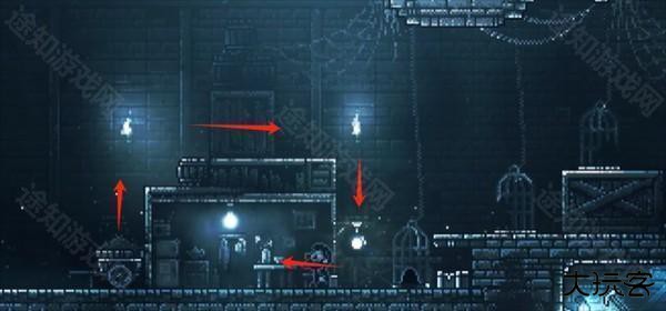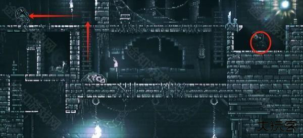 12、爬上吊灯右边的平台,柱子会断裂,把之前推断的柱子推过来修复平台,从平台往左跳过去,获得钥匙。
